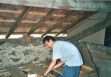 On a enlevé quelques planches du parquet au dessus de la fenêtre pour avoir plus de lumière, et on a chassé les arachnides avec l'insecticide et l'aspirateur.