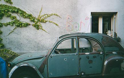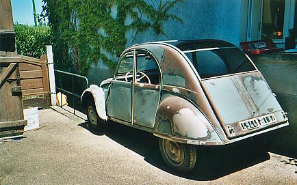 On a descendu le frigo dans la 2 chevaux, et j'ai remplacé un des deux phares par un spot vert...