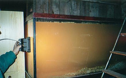 Mais, imprévu, le sable rouge a troublé l'eau, ce qui a donné à l'aquarium un aspect soupe de poule rouge... à l'esturgeon, que ça n'avait pas l'air de gêner beaucoup...
